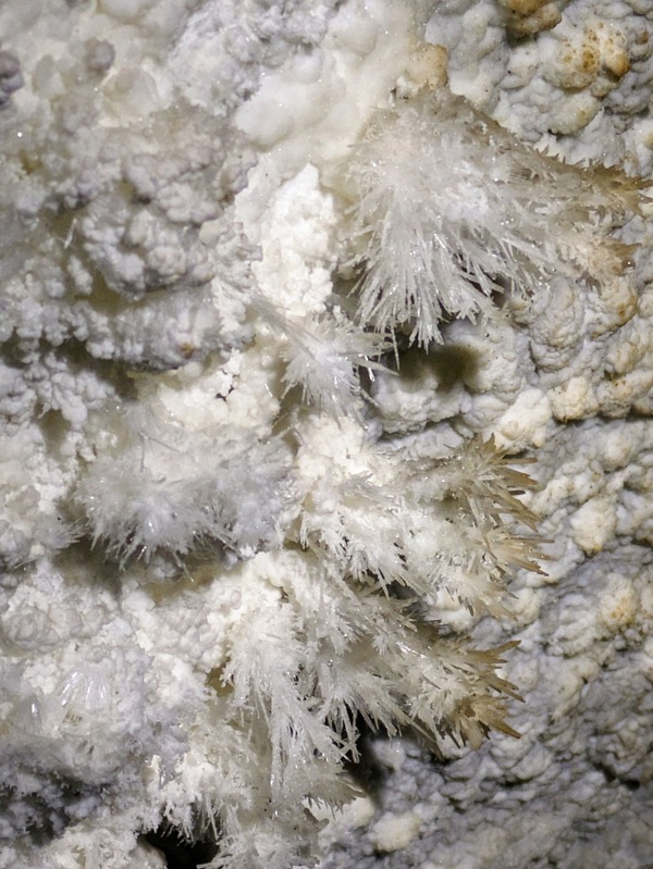 Aragonite frostwork, taken in a cave in Nevada during field work. Mr. Rice writes, "Anthodites are speleothems (cave formations) composed of long needle-like crystals situated in clusters which radiate outward from a common base. Most anthodites are made of the mineral aragonite (a variety of calcium carbonate, CaCO3), although some are composed of gypsum (CaSO4ยท2H2O). The "needles" may be quill-like or feathery."